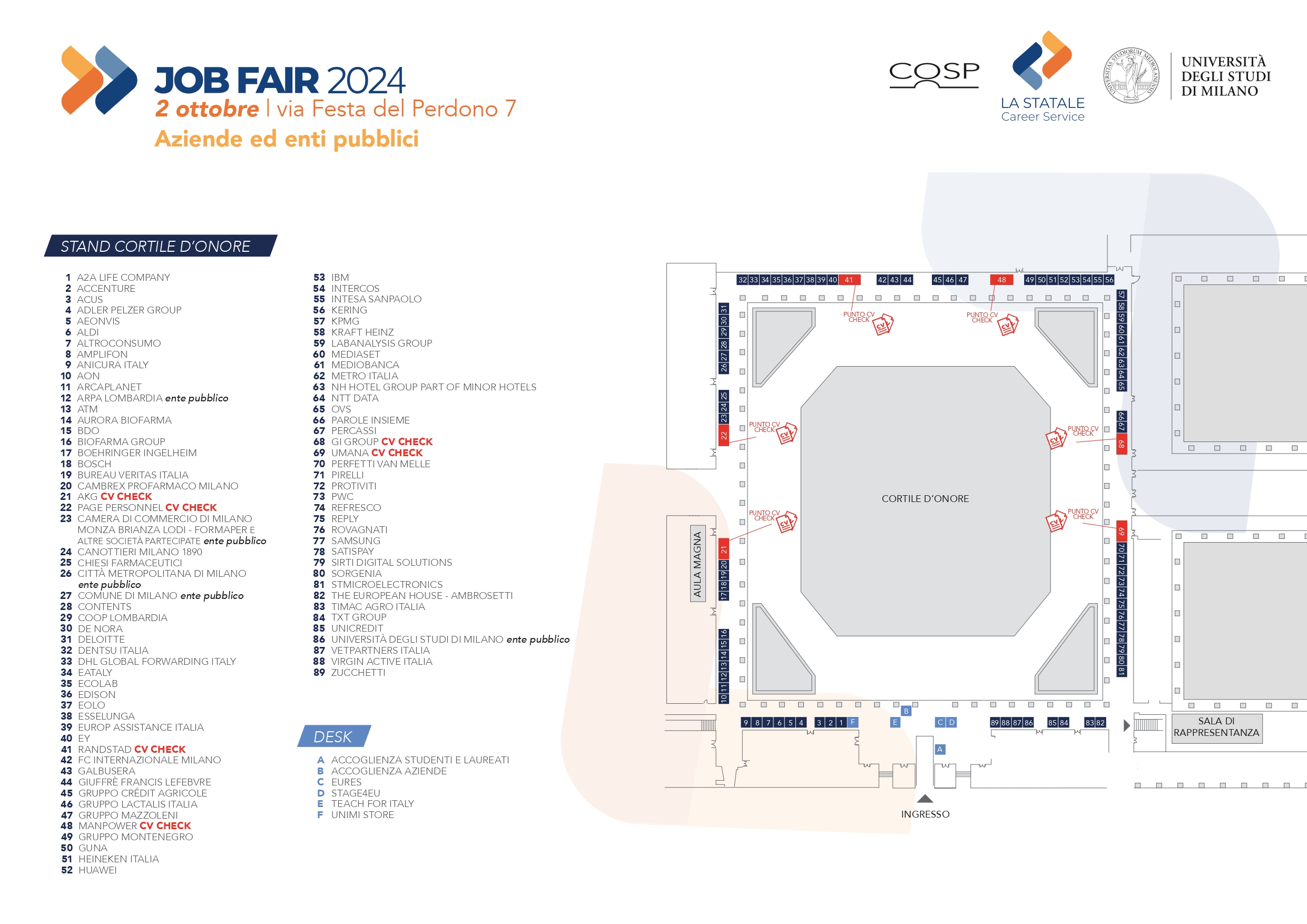 I referenti delle aziende e degli enti pubblici saranno presenti in via Festa del Perdono 7 con orario continuato dalle 10.00 alle 17.00 per ricevere i CV digitali degli/delle interessati/e e conoscerli/e attraverso un breve colloquio one-to-one.